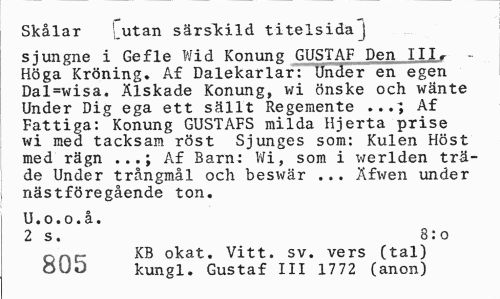 //// Skålar utan särsMld titelsida J //// sjungne i Gefle Wid Konung GUSTAF Den IUr -Höga Kröning. Af Dalekarlar: Under en egen Dal=wisa. Älskade Konung, wi önske och wänte Under Dig ega ett sällt Regemente Af //// Fattiga: Konung GUSTAFS milda Hjerta prise wi med tacksam röst Sjunges som: Kulen Höst med rägn .Af Barn: Wi, som i werlden trä-de Under trångmål och beswär ... Äfwen under nästföregående ton. //// U.o.o.å. //// 2 s. 8:0 //// Qr.r KB okat. Vitt. sv. vers (tal) //// OUD kungl. Gustaf III 1772 (anon) ////