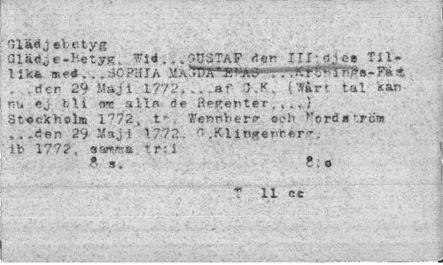//// GlMj eY. otyg //// Gl&^c.Kétyg. Wid .. _'^TAP der III-ojee Tillika m ett. . »läOPHlA MaSöAMS ^JW' ^ft^t^ff^^s - Fä st . .der 29 Maj i 1772»,..af G. K, (Wårt tal kan nu ej bli om alla de Regerter„,,} Stackhel® 1772, i*S Wennberg och Mords tr öm ...d-en 29 Maj i 1772, (i .Kl i ögen* ers-, ib 1772, samma tr:i //// 8 s. t. o //// > 11 cc ////