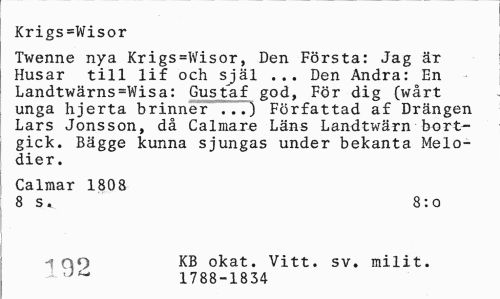 //// Krigs=Wisor //// Twenne nya Krigs=Wisor, Den Första: Jag äT Husar till lif och själ ... Den Andra: En Landtwärns=Wisa: Gustaf god, För dig (wårt unga hjerta brinner ...) Författad af Drängen Lars Jonsson, då Calmare Läns Landtwärn bortgick. Bägge kunna sjungas under bekanta Melodier. //// Calmar 1808 //// 8 s. 8:0 //// i no KB okat. Vitt. sv. milit. //// 1788-1834 ////