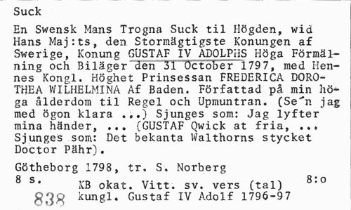 //// Suck //// En Swensk Hans Trogna Suck til Högden, wid Hans Maj:ts, den Stormägtigste Konungen af Swerige, Konung GUSTAF IV ADOLPHS Höga Förmäl-ning och Bilägerllen~"3l October 1797, med Hennes Kongl. Höghet Prinsessan FREDERICA DORO-THEA WILHELMINA Af Baden. Författad på min höga ålderdom til Regel och Upmuntran* (Se^n jag med ögon klara ...) Sjunges som: Jag lyfter mina händer, ... (GUSTAF Qwick at fria, ... Sjunges som: Det bekanta Walthorns stycket Doctor Pähr). //// Götheborg 1798, tr, S. Norberg //// 8 s* KB okat. Vitt. sv. vers (tal) 8:0 //// kungl. Gustaf IV Adolf 1796-97 ////