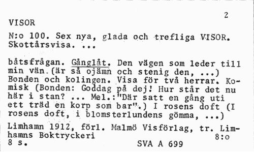 //// 2 //// VISOR //// M:o 100. Sex nya, glada och t re .fl i ga VISOR. Skottårsvisa. ... //// båtsfrågan. Gånglåt. Den vägen som leder till min vän.(är så ojämn och stenig den, ...) Bonden och kolingen. Visa för två herrar. Komisk (Bonden: Goddag på dej.' Hur står det nu här i stan? ... Mel.. 'Där satt en gång uti ett träd en korp som bar".) I rosens doft (I rosens doft, i blomsterlundens gömma, ...) //// Limhamn 1912, förl. Malmö Visförlag, tr. Limhamns Boktryckeri 8:o 8 s. SVA A 699 ////