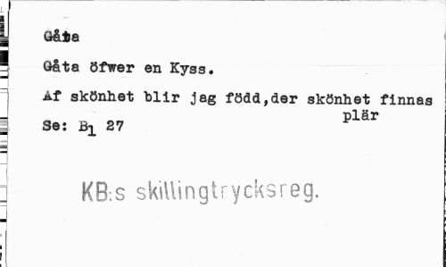 //// I //// y Gåta //// Gåta öfwer en Kyss. //// At skönhet blir jag född,der skönhet finnas //// plär //// | Se: B1 27 //// ] KB.s skiUingtrycksreg. j //// i ////