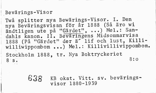 //// Bevärings-Visor //// Twå splitter nya Bewärings-Visor. I* Den nya Beväringsvisan för år 1888 (Så äro wi ändtligen ute på "Gärdet", ...) Mel.: San-. dahls kanon. II. Bevarmgens Midsommarvisa j 1888 (På "Gärdet" der ä" lif och lust, Killi-williwippombom ...) Mel.: Killivillivippombom. //// ' Stockholm 1888, tr. Nya Boktryckeriet 8 s. 8:o //// 638 okat. Vitt. sv. bevärings- //// visor 1880-1939 ////