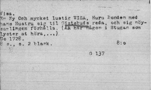 //// Vina., //// Sr Ty Och mycket lustig WISA, Huru Bonden med b.ar.3 Huatru si£ til Gä atefrud s reda, och sig nöy-sarlingen förhålla. (AR hoT^ågon i Stugan som lyster at höra,..,) Qo 1728. //// B s. , s . 2 Vlank. 8:0 //// G 137 ////
