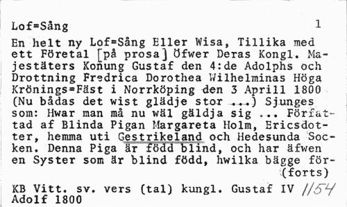 //// Lof=Sång 1 //// En helt ny Lof=Sång Eller Wisa, Tillika med ett Företal [på prosa] öfwer Deras Kongl. Majestäters Konung Gustaf den 4:de Adolphs och Drottning Fredrica Dorothea Wilhelminas Höga Krönings=Fäst i Norrköping den 3 Aprill 1800 (Nu bådas det wist glädje stor ) Sjunges som: Hwar man må nu wäl gäldja sig ... Författad af Blinda Pigan Margareta Holm, Ericsdotter, hemma uti Gestrikeland och Hedesunda Socken. Denna Piga är född blind, och har äfwen en Syster som är blind född, hwilka bägge fortfort s) //// KB Vitt. sv. vers (tal) kungl. Gustaf IV //5Y Adolf 1800 ////