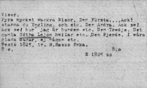 //// Vi»er. . //// Fyra rcycket wacicra Wisor, Der Första,».,Ack! stanna du Yngling, och etc. Der Ardra. Ack se| Ack S0l hur' jag är bunden etc. Den Tredje. Det gamla got ha Le^or, hv|lar etc. .Den fjerde. I wåra -lada ffapatv"' «j^ågon etc. Vexi ö 1-835, 11* Rasks Änka, 8 s. 3;o //// 1 182* pp ////