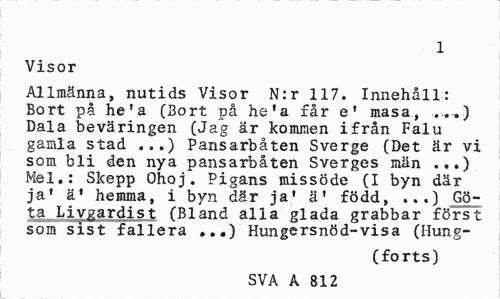 //// 1 //// Visor //// Allmänna, nutids Visor N:r 117. Innehåll: Bort på he'a (Bort på he'a får ef masa, ..-.) Dala beväringen (Jag är kommen ifrån Falu gamla stad ...) Pansarbåten Sverge (Det är vi som bli den nya pansarbåten Sverges män ...) Mel.: Skepp Ohoj. Pigans missöde (I byn där ja' ä' hemma, i byn där ja1 ä' född, ...) Gö-ta Livgardist (Bland alla glada grabbar först som sist fallera »..) Hungersnöd-visa (Hung- //// (forts) //// SVA A 812 ////