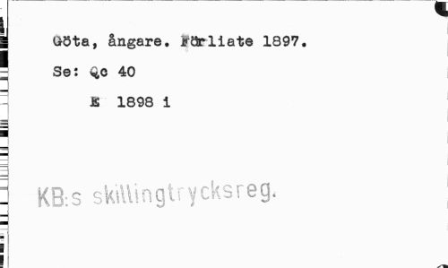 //// i Göta, ångare. Förliate 1897. ! Se: <*c 40 //// JS 1898 1 //// i //// : KB:S skillingtrycksreg. //// i i ////