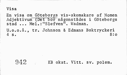 //// Visa //// En visa om Göteborgs vis-skomakare af Nomen Adjektivum (Det bor någonstädes i Göteborgs stad ... Mel.:"Slefven". Wadman. //// U.o.o.å., tr. Johnson S Edmans Boktryckeri 4 s. 8:0 //// 942 KB okat. Vitt. sv. polem. ////