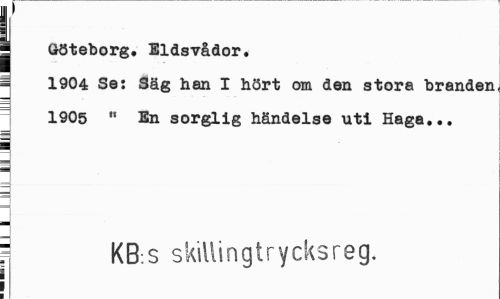 //// I //// j Göteborg. Eldsvådor. //// ¦ 1904 Se: Säg han I hört om den stora branden 1905 " En sorglig händelse uti Haga... //// ' KB.s skillingtrycksreg. //// ! I ////