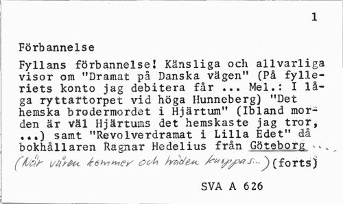 //// 1 //// Förbannelse //// Fyllans förbannelse! Känsliga och allvarliga visor om "Dramat på Danska vägen" (På fylleriets konto jag debitera får ... Mel.: I låga ryttartorpet vid höga Hunneberg) "Det hemska brodermordet i Hjärtum" (Ibland morden är väl Hjärtums det hemskaste jag tror, ...) samt "RevoIverdramat i Lilla Edet" då bokhållaren Ragnar Hedelius från Göteborg ^ „ //// f/L'$r vfir&u ^ahn^ey ooU hnc/e*. /rnjytts... ) (forts) //// SVA A 6 26 ////