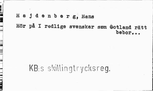 //// ! //// j //// \ Hajdenberg, Hans //// - Hör på X redlige svenskar som Öotland rätt = bebor... //// I //// I //// J //// = KB:S skillingtrycksreg. //// H ////