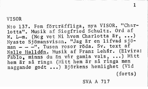 //// 1 //// VISOR //// N:o 137. Fem förträffliga, nya VISOR. "Charlotta". Musik af Siegfried Schultz. Ord af W. L-m. (Neg vet Ni hvem Charlotta är, ...) Nyaste Sjömansvisan. "Jag är en lifvad sjöman ---". Tusen rosor röda. Sv. text af //// Nalle Halidén. Musik af Franz Lehår. (Elvira: Pablo, minns du än vår gamla vals, ...) Mitt hem är så ringa (Mitt hem är så ringa men naggande godt ...) Björkens hemlighet (Vid //// (forts) //// SVA A 717 ////