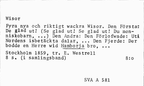 //// Wisor //// Fyra nya och riktigt wackra Wisor. Den Första: De glad ut.1 (Se glad ut.' Se glad uti Du men-niskobarn, ..,) Den Andra: Den Förlofwade: Uti Nordens isbetäckta dalar, ... Den Fjerde: Der bodde en Herre wid Hamborja bro, ... //// Stockholm 1859, tr. E. Westrell 8 s. (i samlingsband) 8:0 //// SVA A 5 81 ////