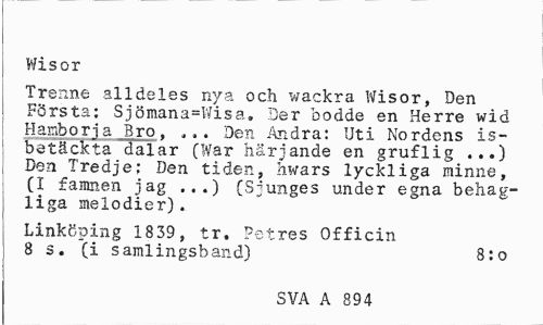 //// Wisor //// Trenne alldeles nya och wackra Wisor, Den Första: Sjömana=Wisa, Der bodde en Herre wid Hamborja Bro. ... Den Andra: Uti Nordens is-1 betäckta "dalar (War härjande en gruflig ...) Den Tredje; Den tiden, hwars lyckliga minne, (I famnen jag ...) (Sjunges under egna behagliga melodier). //// Linköping 1839, tr. Pötres Officin 8 s. (i samlingsband) 8:o //// SVA A 894 ////