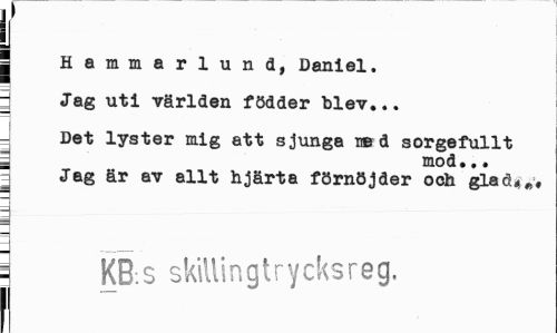 //// I //// j Jag uti världen födder blev... //// Det lyster mig att sjunga ned sorgefullt 7 mod.. • //// Jag är av allt hjärta förnöjder och glad<„. //// i KB s skillingtrycksreg. //// i1 ////