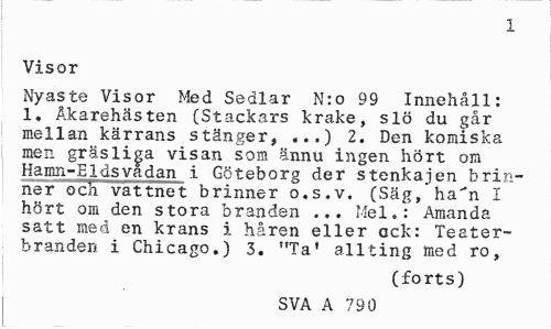 //// I //// Visor //// Nyaste Visor Med Sedlar N:o 99 Innehåll: 1. Åkarehästen (Stackars krake, slö du går mellan kärrans stänger, ...) 2. Den komiska men gräsliga visan som ännu ingen hört om Hamn-Eldsvadan i Göteborg der stenkajen brinner och vattnet brinner o.s.v. (Säg,'ha"n I hört om den stora branden ... Mel.: Amanda satt med en krans i håren eller ack: Teaterbranden i Chicago.) 3. "Ta' allting med ro, //// (forts) //// SVA A 790 ////
