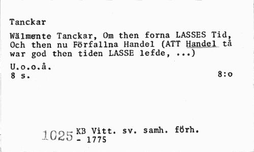 //// Tanckar //// Wälmente Tanckar, Om then forna LASSES Tid, Och then nu Förfallna Handel (ATT Handel tå war god then tiden LASSE lefde, ...) //// U.o.o.å. //// 8 s. 8:0 //// fPntrKB Vitt. sv. samh. fÖrh. lU^b . 1775 ////