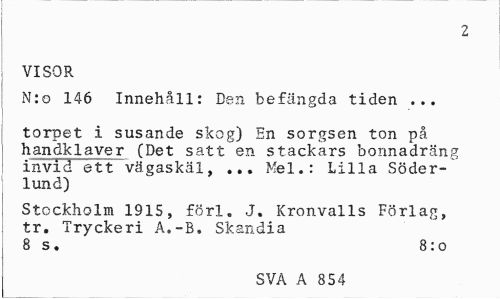 //// 54 //// VISOR //// N:o 146 Innehåll: Den befängda tiden ... //// torpet i susande skog) En sorgsen ton på handklaver (Det satt en stackars bonnadräng invid ett vägaskäl, ... Mel.: Lilla Söderlund) //// Stockholm 1915, förl. J. Kronvalls Förlag, tr. Tryckeri A.-B. Skandia 8 s. 8:o //// SVA A 8 54 ////