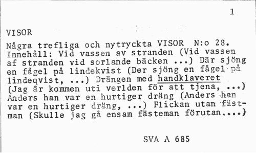 //// 1 //// VISOR //// Några trefliga och nytryckta VISOR N:o 28. Innehåll: Vid vassen av stranden (Vid vassen af stranden vid sorlande bäcken ...) Där sjöng en fågel på lindekvist (Der sjöng en fågel-på lindeqvist, ...) Drängen med handklaveret (Jag är kommen uti verlden för att tjena, ...) Anders han var en hurtiger dräng (Anders harvar en hurtiger dräng, ...) Flickan utan fästman (Skulle jag gå ensam fästeman förutan,...> //// SVA A 685 ////