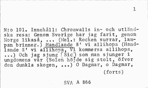 //// 1 //// N:o 101. Innehåll: Chronwalls in~ och utländska resa: Genom Sverige har jag farit, genom Norge likaså, ... (Mel.: Rocken surrar, lampan brinner.) Handlande ä' vi allihopa (Handlande ä' vi allihopa, Vi kommersa allihopa, ...) Och jag sjung" fSic^l som man sjunger i ungdomens vår (Soieh höjde sig stolt, öfver den dunkla skogen, ...) O Dagmar, o Dagmar, //// (forts) //// SVA A 8 1 ////