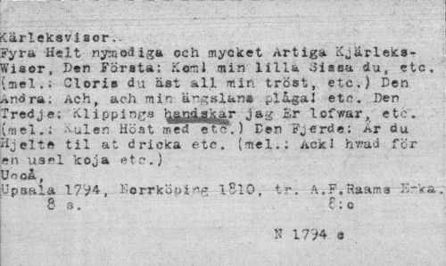 //// kärleksvisor.. //// ?yra Helt nymodiga och mycket Artiga Kjärleks-Visor, Den Första; Kem i min lilla 3issu du, etc, [mel.; Cloris du äst all min tröst, etc.) Den indra, Ach, ach min ängslan® plågaJ etc. Den rredje; Klippings jag Sr lofwar, etc:, //// [mel.; ^ulen Höst med etc.) Ben Fjerde: Ar du äjelte til a t dricka etc. (mel.; AckJ hvrad för »n -usel koja etc.) Jo oa t //// Upsala 17V4, Korrköpin*? iSlO, tr. A.F.Haama Errka. 8 s. e:C //// N 1794 a ////