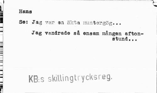 //// l //// y Hans //// ¦ Se: Jag var an äkta muntergög... J //// Jag vandrade så ensam mången aftonstund.. . //// i //// i //// 3 KB:S skillingtrycksreg. ////