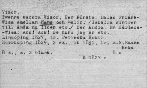 //// Visor. //// Twerwe wackra »Visor, Den Företa: Da lek Friare-Wisa emellan Hane och /Iskalla wint-rer //// till ända nu Tider etc./ Den Andra: En &ärle*s--tfisa; ACki Ack! 3e huru jag är etc. .Linköping 1Ö27, tr. Petreslfc* Boktr. Norrköping 1829, 2 ex., ib 1&31, tr. A.F.Raams //// Enka //// s. 2 blank, 8;o //// K 1&27 c ////