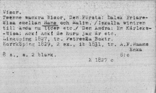 //// Visor, //// Tvenne wacicra Wisor, Den Första: Dals* Friare-ai sa emellan Hane och *allr>/ Je*aila wintren till ända nu *TT?er etc,/ Den Andra: En Kärleks--Wisa: kc!c Ackl Se huru jag år etc. Linköping 1827, tr. ^etresSU BoKtr. Kofrkop^n^ 1629, 2 ex,, ifc 1S31, tr. A. V.«aawa //// Enka //// 8 s., s. 2 blank. B:o //// X. ** O r? ». //// & iC<r i C ////