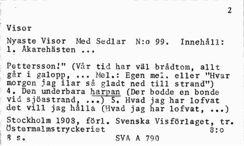//// 2 //// Wisor //// Nyaste Visor Med Sedlar N:o 99. Innehåll: 1. Åkarehästen ... //// Pettersson!" (Vår tid har väl brådtom, allt går i galopp, ... Mel.: Egen mel. eller "Hvar morgon jag ilar så gladt ned till strand") 4. Den underbara harpan (Der bodde en bonde vid sjöastrand, ..«) 5. Hvad jag har lofvat det vill jag hålla (Hvad jag har lofvat, ...) //// Stockholm 1903, förl. Svenska Visförlaget, tr. Östermalmstryckeriet 8:o //// | 3 S. SVA. k 790 ////
