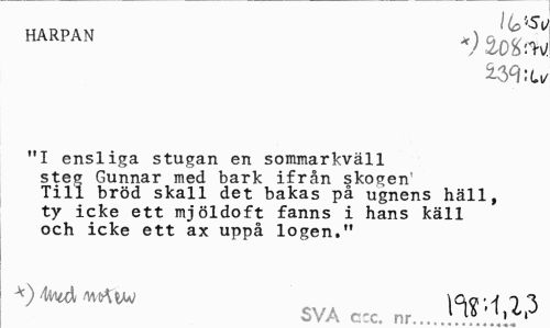 //// I (o ''51 //// HARPAN *) //// "I ensliga stugan en sommarkväll steg Gunnar med bark ifrån skogen' Till bröd skall det bakas på ugnens häll, ty icke ett mjöldoft fanns i hans käll och icke ett ax uppå logen." //// miAiw ^ 3 //// w1 v* jf^i Oi La nr... ^ ^ ////