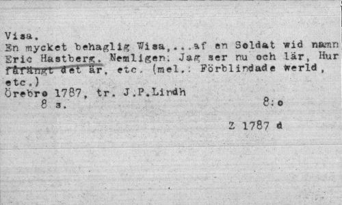 //// Visa. //// Sn mycket behaglig Wisa,.,.af en Soldat wid nämn Eric Hastberg. Kemiigen. Jag ser nu och lar, Hur fårängt"iTeT ar, etc. (mel,; Förblindade werld, etc .) //// Örebro 1787, tr. J.P.Lindh //// 8 s. 8; o //// Z 1787 d ////