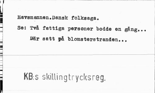 //// 1 //// j Havsmannen.Dansk folksaga. - Se: Två fattiga personer bodde en gång... Där satt på blomsterstranden... //// i //// i KB.s skillingtrycksreg. ////