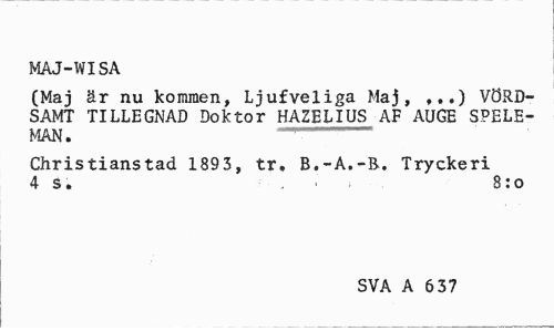 //// MAJ-WISA //// (Maj är nu kommen, Ljufveliga Maj, .) VÖRDSAMT TILLEGNAD Doktor HAZELIUS AF AUGE SPELEMAN. ""-- //// Christianstad 1893, tr. B.-A.-R. Tryckeri 4 s. 8:o //// SVA A 637 ////