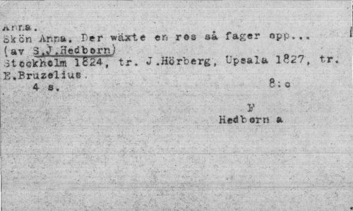 //// Anr.a. //// Skön Anna. Per wäxte en ros sa fager opp.,, (av S.J.Hedborn) //// Stockhclm 1624, tr. J.Hörberg, Upeala 1827, tr. B*Bruzoliue. //// 4 s. 8 ; o //// 1' //// Hed b or n a ////