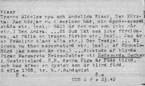 //// Vi a or //// Trenre Alöeles nya och Andeli^a Wisor, Den Första; Jap- börjar nu i werlcen här, min dy#de-spegel skåda etc. (mel.; Säll är den ftan som icke etc,) Den Andra; ...OJ Gud lät oss icke ferglön-na. at fälla er trogen förbön etc. (mel,; Jag är er Frajruirf' bland alla etc.) Der Tredje; ... Wi önaka nu then morgonstund etc, (mel.; Af Himmel»» Kögd jag kommen är etc.) . ..diektade af blinda Fi/rar Margareta Fries-Dotter uti jledeaurda Sockei i Gestrikelard. K.B. denna Figa är Född blir.d, och har äfwen er Syster som är blind född, G ef le 1788 , t r. F. ? .Sund qv/i st //// 6 s. 8.0 //// UUB 2 P ä 23;42 ////