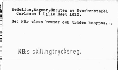//// l( //// y Hedelius»ftagnar.Skjuten av överkonstapel //// | Carlsson i Lilla Edet 1910. //// ^ Se: När våren kommer och träden knoppas... //// 3 //// T //// ^ KB;S skillingtrycksreg. ////