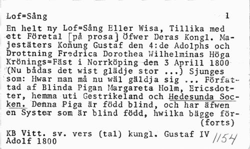//// Lof=Sång 1 //// En helt ny Lof=Sång Eller Wisa, Tillika med ett Företal [på prosa] öfwer Deras Kongl. Majestäters Konung Gustaf den 4:de Adolphs och Drottning Fredrica Dorothea Wilhelminas Höga Krönings-Fäst i Norrköping den 3 Aprill 1800 (Nu bådas det wist glädje stor ...) Sjunges som: Hwar man må nu vräl gäldja sig ... Författad af Blinda Pigan Margareta Holm, Ericsdotter, hemma uti Gestrikeland och Hedesunda Socken. Deftna Piga är född blind, och har äfwen en Systear som är blind född, ivwilka bägge förkorts) //// KB Vitt. sv. vers (tal) kungl. Gustaf IV hrii Adolf 1800 //ö7 ////
