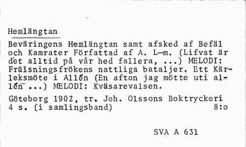 //// Hemlängtan //// Beväringens Hemlängtan samt afsked af Befäl och Kamrater Författad af A. L-m. (Lifvat är det alltid på vår hed fallera, ...) MELODI: Frälsnings frökens nattliga bataljer, Ett Kärleksmöte i Allén (En afton jag mötte uti al?-lén*...) MELODI: Kväsarevalsen. //// Göteborg 1902, tr. Joh. Olssons Boktryckeri 4 s. (i samlingsband) 8:0 //// SVA A 631 ////