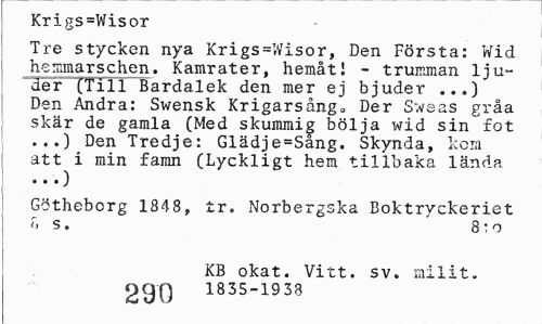 //// Krigs=Wisor //// Tre stycken nya Krigs=Wisor, Den Första: Wid hemmarschen. Kamrater, hemåt i - trumman lju-"äer (Till Bardalek den mer ej bjuder ...) Den Andra: Swensk Krigarsång* Der Sweas gråa skär de gamla (Med skummig bölja wid sin fot ...) Den Tredje: Glädje=Sång. Skynda, kem att i min famn (Lyckligt hem tillbaka lända //// Göthebcrg 1848, tr. Norbergska Boktryckeriet //// h s. 8:0 //// KB okat. Vitt. sv. railit. 23Q 1835-1938 ////