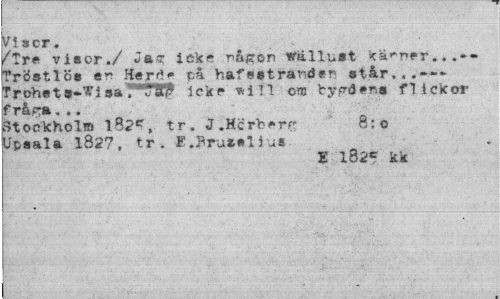 //// Viser. //// /Tre visor./ Ja? icke r>a£on vällust kärwr.»• Tröstlös er Herr»-* på haf»stränder; »tår,..— ? iTrehets-^i sar^TS^ Icke oro by^d ena flickor //// fråga. .. //// Stockholm 182*, tr. J.Hcrberft 8; o //// Upeala 1827, tr. E.Prutelius //// E 182c kk ////