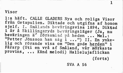 //// X //// Visor //// l:a häft. CALLE GLADERS Nya och roliga Visor från Getapulien. Diktade och utgifna af honom sjelf. I. Smålands beväringsvisa 1894. Diktad i år å Skillingaryds beväringsläger (Ja, nu beväringen ä" församlad på heden ... Mel.: "Petter Jönsson han säg i ...") II. En ynke-lig och rörande visa om "Den gode herden" i Fårarp (Uti en vrå af Småland, vår mörkaste provins, Känd melodi) Hallelujaflickan //// (forts) //// SVA A 56 ////