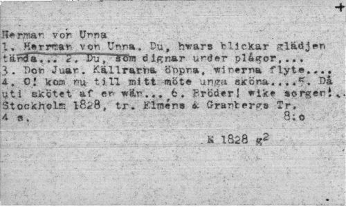 //// ar v or Urna //// I» . Karrniaw-. v or Unna. Du, hvars blickar gläd lan t äncTa™ .< 7"15ut ~5"8m dignar urder plågor,... 3. Por Juar. Källrarna önpra, vinerna flyta... A, Q t ko® nu till mitt möta ur?p skör,a. . . ,5 • Uti skötet af en var... 6. Eröderl vifcf aorgeri,. Stockholm 1828, tr. Flméns k Granberga Tr, 4 a. ' 8;o 1 //// . S 1828 ////