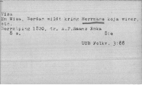 //// Visa //// En Wisa, Nordan wi Id t kring Herrmans koja wmer, etc. . i "wrnmt-r. //// Norrköping 1820, -tr, A.F.Raams Enka //// 8 s. 8:0 //// UUB Fclkv. 3:88 ////