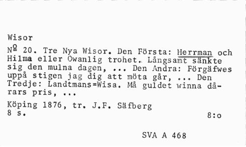 //// Wisor //// N- 20. Tre Nya Wisor. Den Första: Herrman och Hilma eller Owanlig trohet- Långsamt sänlcte sig den mulna dagen, ... Den Andra: Förgäfwes uppå stigen jag dig att möta går, ... Den Tredje: Landtmans=Wisa. Må guldet winna dårars pris, ... //// Köping 1876, tr. J.F. Säfberg 8 s. 8:o //// SVA A 468 ////