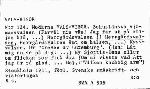 //// VALS-VISOR //// N:r 124. Modärna VALS-VISOR. Bohuslänska sjömansvalsen (Farväl min vän.' Jag far ut på böljan blå, ...) Herrgårdsvalsen (I Herrgårdsvalsen, Herrgårdsvalsen ömt om halsen, ...} Kyss-valsen. Ur "Greven av Luxemburg". (Han: Låt mig nu se på dig! Ny Sjottis-Dans eller //// om flickan som fick åka (öm ni visste vad Att jag är så glad, ««é Mel.:"Vilken knubbig arm") //// Stockholm 1911, förl. Svenska småskrift- och visförlaget g:o //// 3 S* SVA A 805 ////