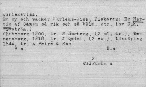 //// Kärlékaviaa, //// Er ny och vacker Kärleka-Wiaa, Fiak&rer; Sr Hor-tifT af Saxer sa rik och så båld , etc. (av U.iTJ " fTO*»trbm. ) //// Cpthaborg 1?00, tr. S.Korberg, (2 olt tr.), We~ neraborg, l?l8, tr. J.^wiat, (2 ex,}, Linköping 1844 tr. ä.Petra <k Son. //// £ a. 8:o //// j //// »Via atrcjj- a ////