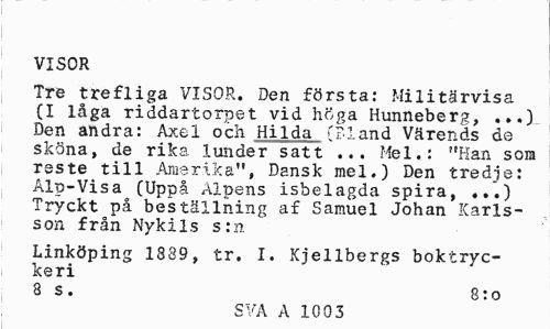 //// VISOR //// Tre trefl iga VISOR. Den första: Militärvisa (I låga riddartorpet vid höga Hunneberg, ...) Den andra: Axel och Hilda fFland Värends de sköna, de rika. lunder satt ... Mel.: "Kan som reste till Amerika", Dansk mel.) Den tredje: Alp-Visa (Uppå Alpens isbelagda spira, ...) Tryckt på beställning af Samuel Johan Karlsson från Nykils s:n //// Linköping 1839, tr. I. Kjellbergs boktryckeri //// 8 s. 8:0 //// SVA A 1003 ////