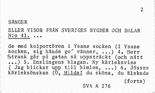 //// 2 //// SÅNGER //// ELLER VISOR FRÅN SVERIGES BYGDER OCH DALAR N:o 41. ... //// de med kolportören i Ysane socken (I Ysane socken, sig hände gC vänner, ...) 4. Herr Strank går på gatan så uppsträckt (och nätt ...) 5,.Enslingens klagan. Ny kärleksvisa ( Jag blickar upp till himlen, .,,) 6. Jösses kärleksönskan (0, Hildai du sköna, du älskade //// (forts) //// SVA A 2 76 ////