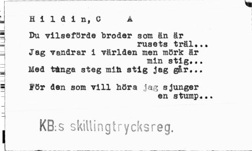 //// J H i 1 d 1 n, C A //// 1 Du vilseföräe broder som än är //// - rusets träl... //// =! Jag vandrar i världen men mörk är //// 1 min stig... //// j Med tAnga steg mih stig jag går... //// | För den som vill höra jag sjunger //// en stump... //// J //// j KB:s skillingtrycksreg. ////